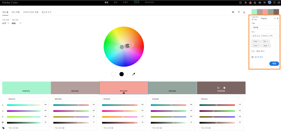 선택한 색상의 유사색상, 단색, 보색, 정사각형, 음영 등을 확인할 수 있는 색상 휠이 있습니다.