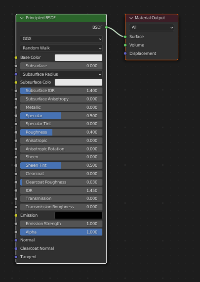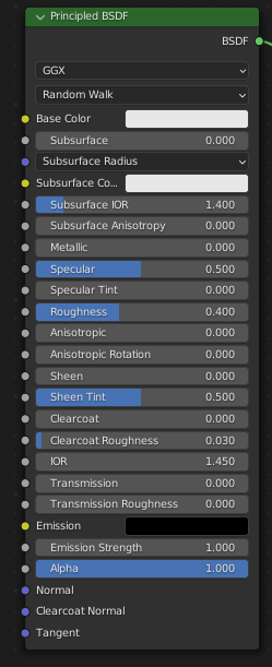여러 계층을 사용하기 쉬운 단일 노드로 결합하는 Principled BSDF는 PBR 셰이더를 사용하는 소프트웨어와 호환되는데, 여기에는 Unreal Engine, Substance Painter과 같은 소프트웨어에서 Painted, Baked한 텍스처를 해당 매개 변수에 직접 연결할수 있습니다.