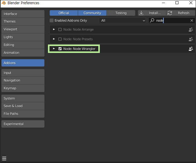 Edit → Preferences → Add-ons → 검색 창에 Node 'Node Wrangler' 체크해서 활성화 하기